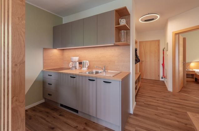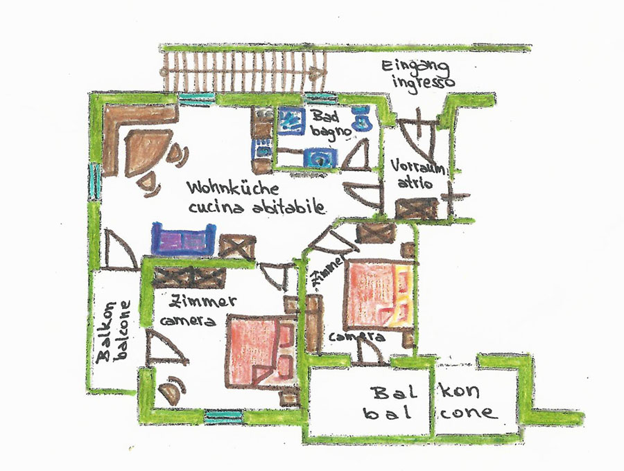 L’appartamento UVA è grande ca. 60 m², si trova al 1. piano e offre posto a 2 – 6 persone. È arredato con cura.