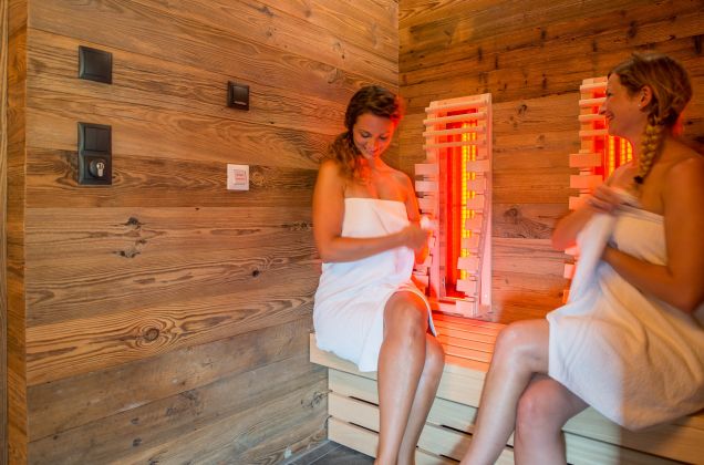 Nell’atrio della sauna la forza magica e riscaldante dei luminosi radiatori infrarossi anima chi è a ricerca di benessere. La tecnica infrarossa a temperatura bassa garantisce calore in profondità che fa effetto: può scogliere irrigidimenti, mitigare dolori di schiena, aumentare l’irrorazione sanguigna, migliorare il metabolismo, rafforzare il sistema immunitario, diminuire carichi da stress, aumentare rigenerazione dopo carichi fisici e promuovere la disintossicazione.